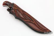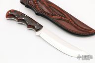 This Hunter by Larry Mensch features David Boye's Dendritic Cobalt, it features a satin finished blade with .135" blade stock and 1.178" blade depth, full tang construction. The handle has stabilized spruce cone scales. Comes with a hand tooled brown leather sheath by Treestump Leather and a zippered case. Excellent condition.