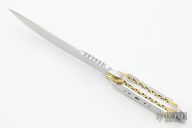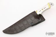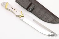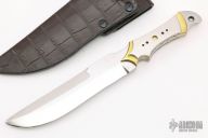 This knife by Aaron Schwartz and ITAC has a hand rub satin finished blade with false top edge and notched thumbrest, .202" blade stock and 1.245" blade depth, full tang construction. The handle has stainless steel scales with fileworked brass liners. Comes with a brown leather over kydex sheath and zippered case. Has some light scratches, otherwise excellent condition.