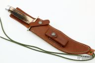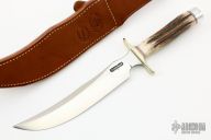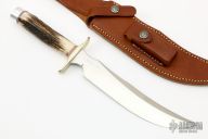The RKS4 is the fourth club knife made by Randall Knives for the Randall Knife Society. The blade is etched "RKS 708/3998". Carbon steel blade with sharpened top edge, .228" blade stock and 1.332" blade depth, hidden tang construction. The handle has nickel silver guard, stag handle with red, white and blue spacers, and a duralumin butt. Comes with a brown leather sheath. Excellent condition.