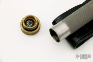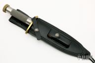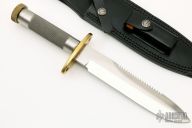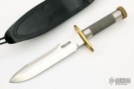 This Model 18-7.5 Attack Survival from Randall Made Knives has a 7.5" blade with sharpened top edge and sawteeth, .235" blade stock and 1.396" blade depth, hidden tang construction. The handle has a brass guard and knurled butt cap, knurled stainless steel handle. Compass in the butt cap. Comes with a black leather sheath. Excellent condition.