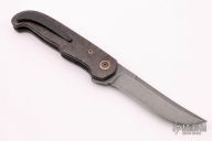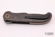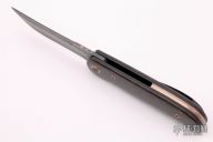 This Copper Persian Flipper by Bob Terzuola features a dark stonewashed blade with false top edge, notched flipper, and three copper pins set in the spine of the blade. The handle has copper infused Fat Carbon scales with copper pivot collars, the screws in the scales have copper collars, black titanium liners, Chad Nichols Copper/Titanium Mokume backspacer, tip up black titanium clip with hidden screws. Rides on bearings, nice detent, lockup and blade seating. Comes with a zippered case. New from maker at the 2021 Friday Night Blade Affair.