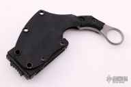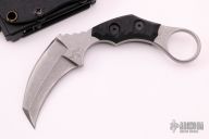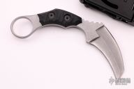 This Custom Karambit by James Coogler features a tumbled hawkbill style blade with sharpened top edge and fileworked thumbrest, .279" blade stock and 1.297" blade depth. The handle is comprised of sculpted black G-10 scales over full tang construction. Exposed tang pommel with 1" finger ring. Includes kydex sheath. Excellent condition.