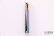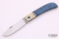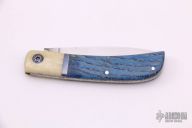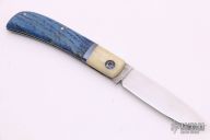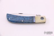This Sodbuster Slipjoint by Fall Creek Knives features a satin finished drop point blade with nail nick. The handle has camel bone bolsters, dyed and stabilized white ash covers over fileworked stainless steel liners and spring, anodized titanium pivot and accent band. Spring is flush in the open and closed positions. Includes original Apple Wood box and COA. Excellent Condition.