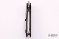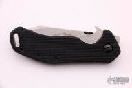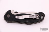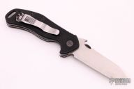 This Bulldog by Emerson Knives features a stonewash chisel ground blade with thumbdisc, notched thumbrest and wave feature. The handle has textured black G-10 scales, titanium liners, American Flag stainless steel clip. Has some scuffs and scratches, and some edge roll on the blade at the tip and corner of the edge. Good condition. Comes with original box and papers. #0157.