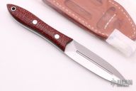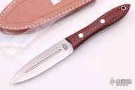 This knife from Bark River Knives features a satin finish double edge blade with .147" blade stock and .966" blade depth. The handle is comprised of the burgundy burlap micarta scales with green G-10 over full tang construction. Lanyard bail on pommel. Includes leather sheath and original box. Excellent condition.