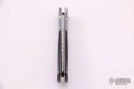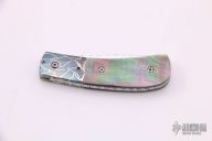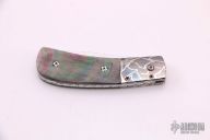 This bolster release auto by Doc Hagen features a mirror polished blade with fileworked spine. The handle has mosaic Damascus bolsters, abalone scales, fileworked titanium liners and fileworked stainless steel backspacer. Nice lockup, action and blade seating. Comes with a leather pouch. Light scuffs/scratches are visible on the blade and handle otherwise the knife is in excellent condition.