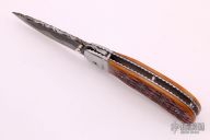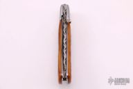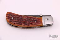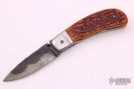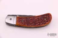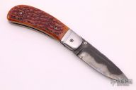 This knife by Alan Davis features a forged finished blade with a single thumbstud and a fileworked blade spine. The handle has fluted steel bolsters and jigged bone scales over file worked steel liners. Scuffs/scratches are visible on the blade/handle otherwise the knife is in good condition. Includes padded zippered case.