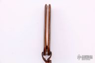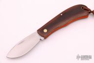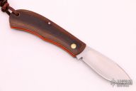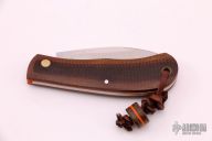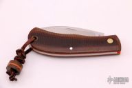This slipjoint by Jeff Pearce features a satin finished blade. The handle has brown canvas micarta covers, orange G-10 liners and a satin stainless steel spring. Has half-stop. Comes with a zippered case and COA dated 6-18-20. Excellent condition.