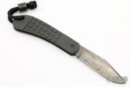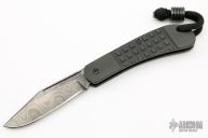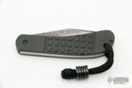 This Backpocket with Lanny's Clip blade by Doc Shiffer features a Chad Nichols Damascus clip point blade with nail nick. The handle has frag pattern zirconium covers with a 52100 steel spring. Has half-stop, flush in all positions. Comes with original box and COA. Has a couple light scuffs, otherwise excellent condition. Comes with a zirconium bead.