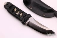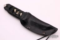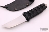 This Wasabi by RJ Martin features a satin finished chisel ground tanto blade, .254" blade stock and 1.226" blade depth, hidden tang construction. The handle has black cord wrap over black stingray skin. Comes with a leather wrapped kydex sheath with mole skin lining. Excellent condition.