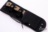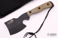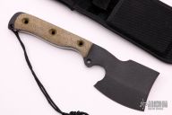 This Paul's Hatchet Combat Grade from the Busse Combat Knife Company features a black coated blade with 3" cutting edge, 1/4" stock, 2 1/2" deep. Full tang construction with crinkle textured canvas micarta scales. Satin finish edge of tang. Great feel in hand. Excellent condition. Comes with a black nylon sheath.