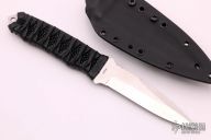 This RJ Martin designed FB11P Kumo Fixed Blade has a satin finished VG-10 drop/ spear point blade with false top edge and notched spine. .098" blade stock, .909" depth. Handle is Japanese wrapped over stingray skin and Spyderco spider logo stainless steel underlay. Exposed tang butt/ glass breaker has lanyard hole. Excellent condition. Comes with Kydex sheath, Tek-Lok clip. Has some scuffs otherwise good condition.