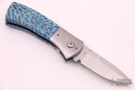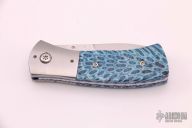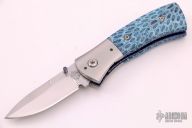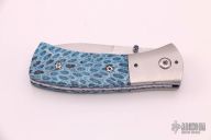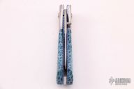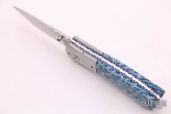 This D/A auto by Doc Hagen features a satin finished blade with fileworked spine, single thumbstud with blue/purple stone inlay. The handle has steel bolsters, bran coral scales, fileworked and anodized titanium liners, steel backspacer, fileworked screws. Nice lockup, action and blade seating. #1395. Includes a COA. Light scuffs/scratches are visible on the blade and handle otherwise the knife is in good condition.