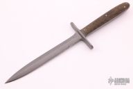 This Dagger by Alex J Collins features a bead blasted double edged chisel ground blade with hollow ground and serrated backside, .169" blade stock and .610" blade depth, full tang construction with steel guard and green canvas micarta scales. Has some light scuffs and oxidation, otherwise good condition.