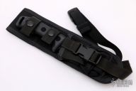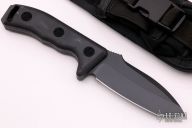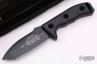 This black tactial Currahee has a tanto plain edge blade, .200" blade stock and 1.516" blade depth, full tang construction. The handle is black canvas micarta. Dated 03/2007 with a serial number of 00782. Includes nylon tactical sheath. Couple light scuffs, otherwise excellent condition