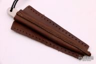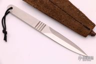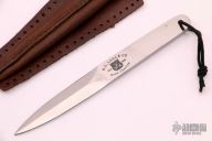 This Lapel Dagger by HG Long and Co features a satin finished double edged blade and handle, .142" blade stock and .536" blade depth, integral construction. Comes with a brown leather sheath. Excellent condition.