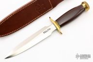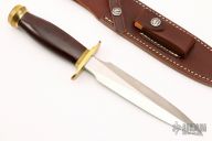 This Model 2-7 by Randall Made knives features a satin finished double edged blade, .220" blade thickness and 1.253" blade depth, hidden tang construction. The Model 2 is a heavily made dagger or dirk. Brass guard and butt, maroon linen micarta grip with black spacers. Comes with a brown leather sheath and original paper wrapping. New condition.