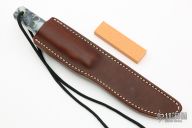 This Model 10 Salt Fisherman and Household Utility features a satin finish drop point blade with swedge and notched thumbrest, .133" blade stock and .906" blade depth. The handle Skull Carvex paper micarta scales over full tang construction. Brass lanyard tube with lanyard in pommel. Includes a brown leather sheath and original paper wrapping. New condition. Carvex is paper micarta with an identical image on each sheet of paper. When it is contoured, the image remains the same. VERY COOL material, I have never seen it before. No idea how many Randalls this is on, but it can't be many.