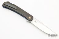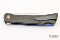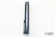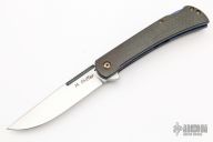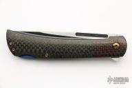 This Sodbuster Linerlock Flipper is a collaboration between Doc and Mike Shiffer, it features a satin finished blade with fileworked thumbrest, flipper and fuller. The handle has red/black carbon fiber bolsters, black carbon fiber scales, anodized titanium liners with jeweled interiors, anodized titanium backspacer, tip up textured zirconium clip, bronzed hardware. This knife is made to look like a lockback, but is a linerlock. Rides on bearings, nice blade seating and lockup, has a strong detent. Comes with a COA. New from maker.