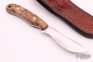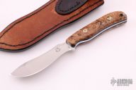 This knife by Albert Trujillo features a mirror finished blade with fileworked spine and tang, .144" blade stock and 1.158" blade depth, full tapered tang construction. The handle has salted burl wood scales with blue liners and brass lanyard hole, has fileworked tang with blue epoxy fill. Comes with a hand tooled brown leather sheath. Excellent condition.