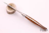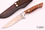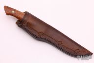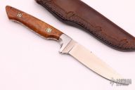 This knife by James Largent features a satin finished drop point blade with fileworked blade spine and tang, .202" blade stock and .942" blade depth, full tapered tang construction. The handle has satin finished dovetailed stainless steel bolsters, burlwood scales and mosaic pins. Comes with a hand tooled brown leather sheath. Excellent condition.