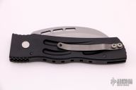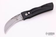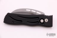 This WarHawk by Rob Dalton features a bead blasted partially serrated blade and black aluminum handle. Strong coil spring. Tip up titanium clip. Excellent condition.