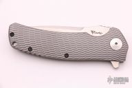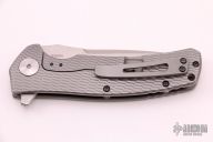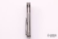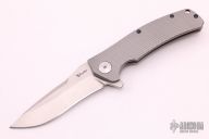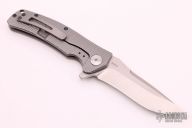 This Horizon B features a stonewashed recurve blade with false top edge, notched thumbrest and flipper. The handle has a milled titanium frame with matching tip up clip. Nice detent, lockup and blade seating. Comes with original box. Excellent condition.