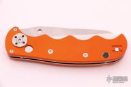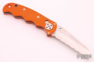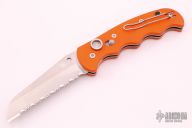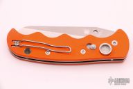 This Spyderco Autonomy features a satin finished fully serrated blade, H-1 Blade steel. The handle has orange G-10 scales, stainless steel liners, and a tip up reversible clip. Has some light scuffs/scratches, otherwise excellent condition. Comes with original box and papers.