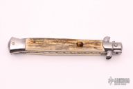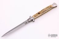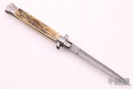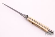 This Swivel Bolster Auto by Frank Beltrame features a Damascus blade with a dagger style blade with a false top edge. The handle has nickel silver bolsters, mammoth scales with brass liners, tiger eye stone push button, fileworked stainless steel backspacer. Excellent condition. Limited Edition 2009