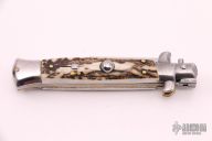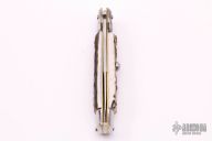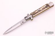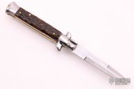 This Swivel Bolster by Frank Beltrame features a bayonet blade with false top edge. The handle is comprised of stainless steel bolsters and pommel with stag scales over brass liners and stainless steel backspacer. Excellent Condition.