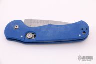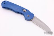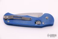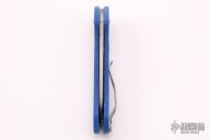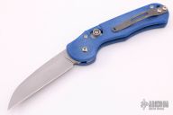 This 06/1 automatic by Rob Dalton features a bead blast wharncliffe blade and blue G-10 frame. Bead blasted tip up titanium clip. Side opening, coil spring. The bar lock release is used to open and close the knife and can be operated with either hand. Has some scuffs on the clip, otherwise excellent condition.