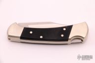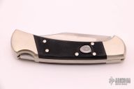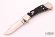This Buck 112 Auto features a satin finished clip point blade. The handle has a nickel silver frame with black G-10 scales. Comes with original box, papers and sheath. Excellent condition.