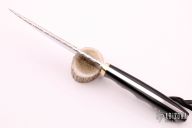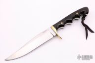 This Hunter by Jim Krouse features a satin finished blade with a fileworked spine, .190" blade thickness and 1.204" blade depth, full tang construction. The handle has a brass guard and black linen micarta scales with brass pins. Light scratches are visible on the guard and blade otherwise the knife is in excellent condition.