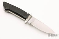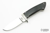 This knife by Elvan Allred features a mirror polished blade with .185" blade stock and 1.059" blade depth, full tapered tang construction. The handle has an engraved nickel silver guard and black linen micarta scales with white liners. Excellent condition.