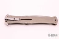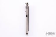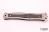 This Madd Maxx 7" Flipper is a Darrel Ralph Design executed by HTM Knives. It features a stonewashed bayonet ground blade with false top edge, fullers. Flipper and dual thumb studs. The handle is comprised of a matte finished titanium frame with machined carbon fiber overlays over barrel spacers, stainless steel pocket clip is positioned for tip down carry. Lanyard hole in pommel. Comes with original box, zippered case and papers. Excellent condition.