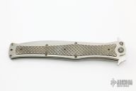 This huge Monster Maxx framelock flipper by Darrel Ralph features a hand rub satin finished blade and satin titanium frame with checker milled titanium inlays. Stainless belt knob. Includes Maxx Glide pivot bearing system for smooth opening. Perfect blade seating, lockup, and function. Excellent finish work. Has a few light scratches, otherwise excellent condition. Comes with a zippered case.