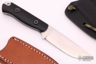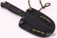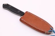 This Bravo Necker II from Bark River features a satin finished blade with notched thumbrest, .130" blade thickness and .955" blade depth, full tang construction. The handle has black G-10 scales with lanyard hole. Comes with a brown leather neck sheath with magnet inside the sheath, comes with a kydex neck sheath as well. Has scratches, otherwise good condition.