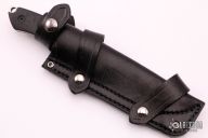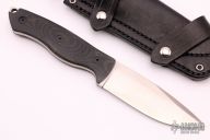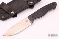 This S-T-S-4 by Bark River features a satin finished blade with false top edge, .200" blade stock and 1.252" blade depth, full tang construction. The handle has black linen micarta scales, extended tang with lanyard hole. Comes with black leather sheath. Excellent condition.