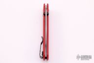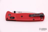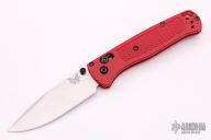 The Benchmade Custom Bugout features a drop point blade with a stonewash finish. It's a manual opener with ambidextrous thumb studs. This AXIS lock has red handles with black hardware, a black mini deep-carry pocket clip, and a lanyard hole. Excellent Condition.