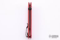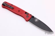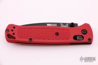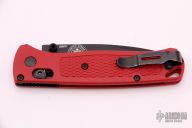 The Benchmade Custom Bugout features a drop point blade with a black finish. It's a manual opener with ambidextrous thumb studs. This AXIS lock has red handles with black hardware, a black mini deep-carry pocket clip, and a lanyard hole. Excellent Condition.