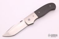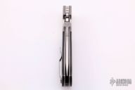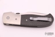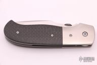 This Hunter Linerlock by Marty Young features a hand rub satin finished blade with false top edge and a thumbdisc and notched thumbrest. The handle lightly orange peel finished titanium bolsters, bead blasted titanium liners, carbon fiber scales, tip up blasted stainless steel clip, black G-10 backspacer. Comes with zippered case. Has a couple very light scratches, otherwise excellent condition.