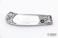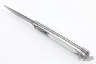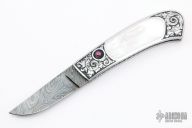 This custom automatic by Ralph Dewey Harris features a Damascus blade with fileworked spine. The handle has an engraved stainless steel frame with fileworked edges, fileworked Damascus backspacer, ruby inlaid push button, mother of pearl inlays. Has some light scratches and a couple small dings in the edges of the frame, otherwise excellent condition.