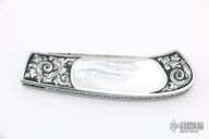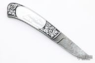 Ralph Dewey Harris is a full time knife maker who sold his first knife in 1978. He makes collector quality interframe folders, autos, and OTF's of his own design. Dewey uses 440C, ATS-34, and commercial damascus for his blades, and 416SS and titanium as well as other steel for the frames. He favors natural materials like ivory, mother of pearl, wood, abalone, and occasionally uses some man made materials like carbon fiber. Dewey is also an accomplished engraver, and his trademark scroll engraving is instantly recognizeable. Dewey was the first custom knifemaker to design and build a double action OTF, and the quality and scarcity of that piece has made it legendary among collectors. Dewey is a voting member of the Knifemakers Guild.