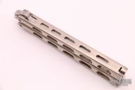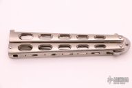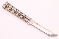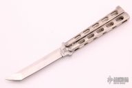 This International Series Tanto Balisong has a satin finished stainless steel blade (marked 1985). Handle is skeletonized aluminum. Solid lock up both open and closed. Has a few light scratches, otherwise excellent condition. Comes with original nylon sheath.