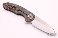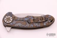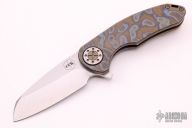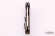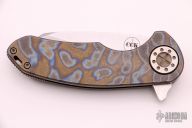 This F3 Medium by Curtiss Knives features a stonewashed blade with notched thumbrest and flipper. The handle has a flamed titanium frame over notched titanium backspacer, matching titanium tip up clip. Smooth and fast opening using a Caged Bearing System. Has a stainless lockface insert. Nice blade seating, detent and lock up. Includes padded and zippered case and a COA dated 7-7-19. Excellent condition.