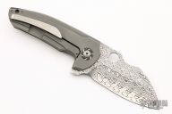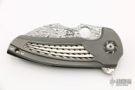This Vented Kinesis by Michael Burch features a Damasteel blade with notched thumbrest, thumbhole and flipper. The handle has a two-tone finished titanium frame with carbon fiber pivot collars and backspace, tip up titanium clip with hidden screws. Has a few light scuffs, otherwise excellent condition. Comes with hard case and COA dated TKI 2020.
