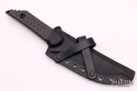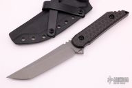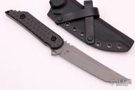 This Fixed Blade Kwaiback by Jake Hoback features a stonewashed tanto blade with notched thumbrest, .160" blade stock and 1.099" blade depth, full tang construction with twill carbon fiber scales. Comes with a kydex sheath and COA. New from maker.