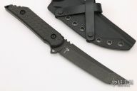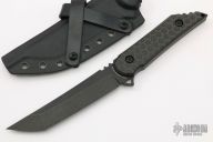 This Fixed Blade Kwaiback by Jake Hoback features a black DLC stonewashed tanto blade with notched thumbrest, .160" blade stock and 1.099" blade depth, full tang construction with twill carbon fiber scales. Comes with a kydex sheath and COA. New from maker.