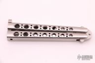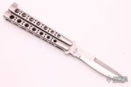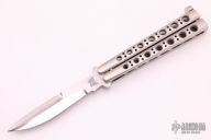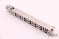 This early balisong from Pacific Cutlery features a Jody Samson ground satin finished blade with sharpened top edge. The handles are stainless steel with hole pattern. Has scratches and some spots on the blade, otherwise good condition. Includes original nylon sheath.