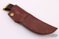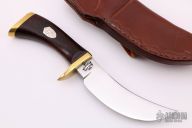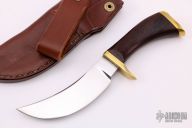 This Skinner by Bill Moran features satin polished upswept blade, .248" blade stock and 1.198" blade depth, hidden tang construction. The handle has a brass guard and butt with beautiful wood handle, has engraved nickel silver escutcheon. Comes with a hand tooled brown leather sheath. Has a couple extremely light scratches, otherwise excellent condition. Has initials engraved on the escuteon, "S.C.D.". Made in Lime Kiln MD.